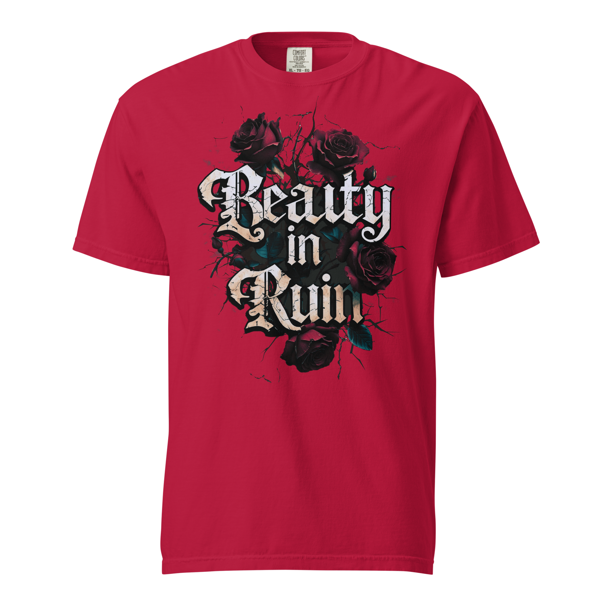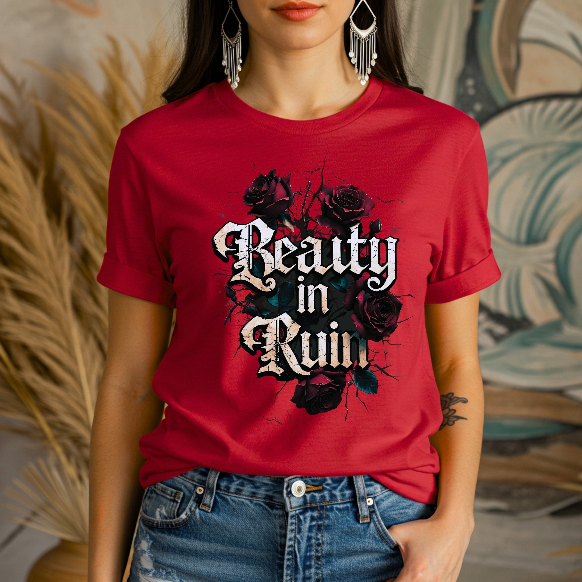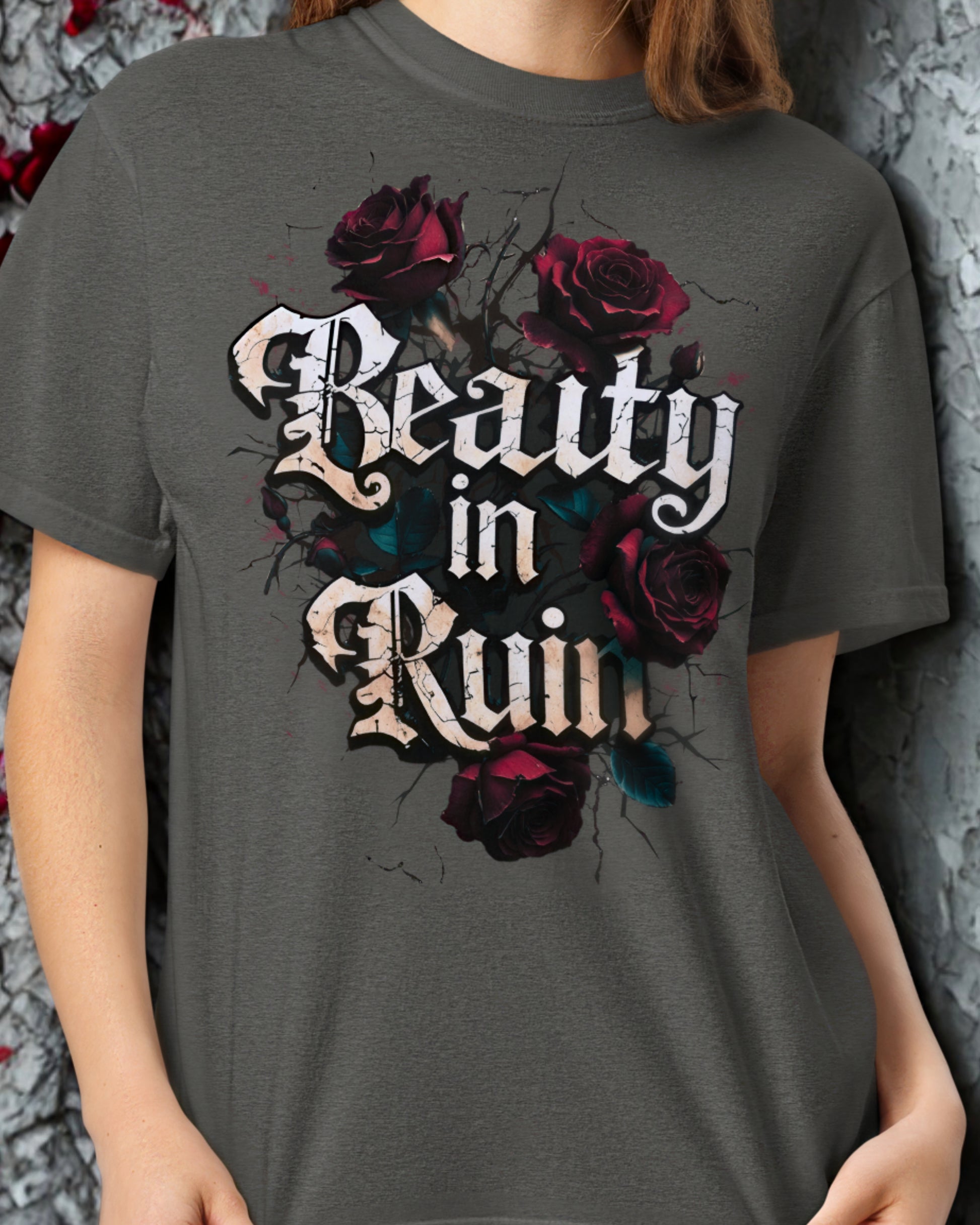 This design takes its cue from vintage tattoo flash and grunge street art: the words “Beauty in Ruin” etched in an edgy cracked font, rough yet delicate, as if chiseled into the side of an abandoned cathedral. Surrounding the phrase: a tangle of thorny roses, petals curling inward, shadows creeping between each bloom.