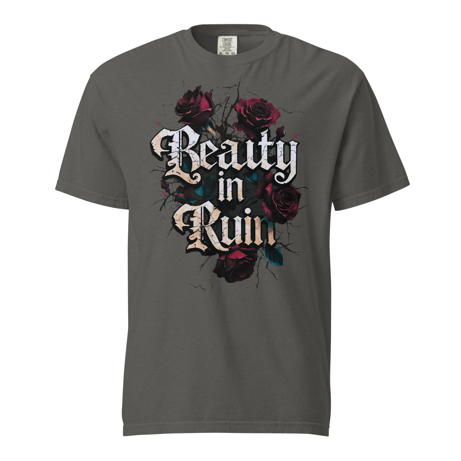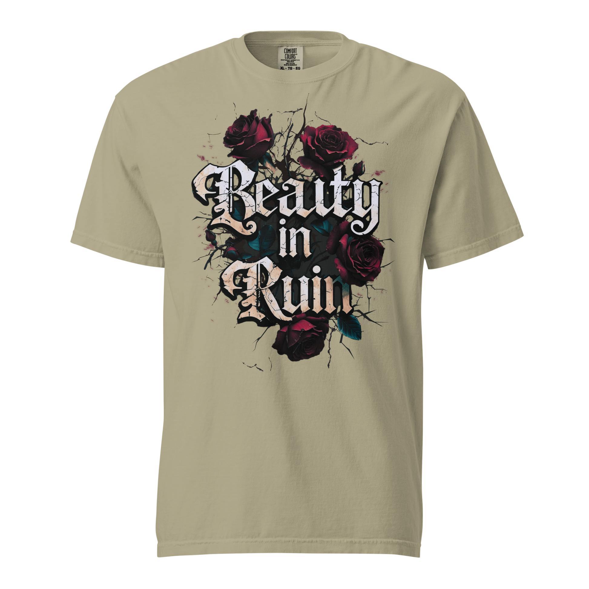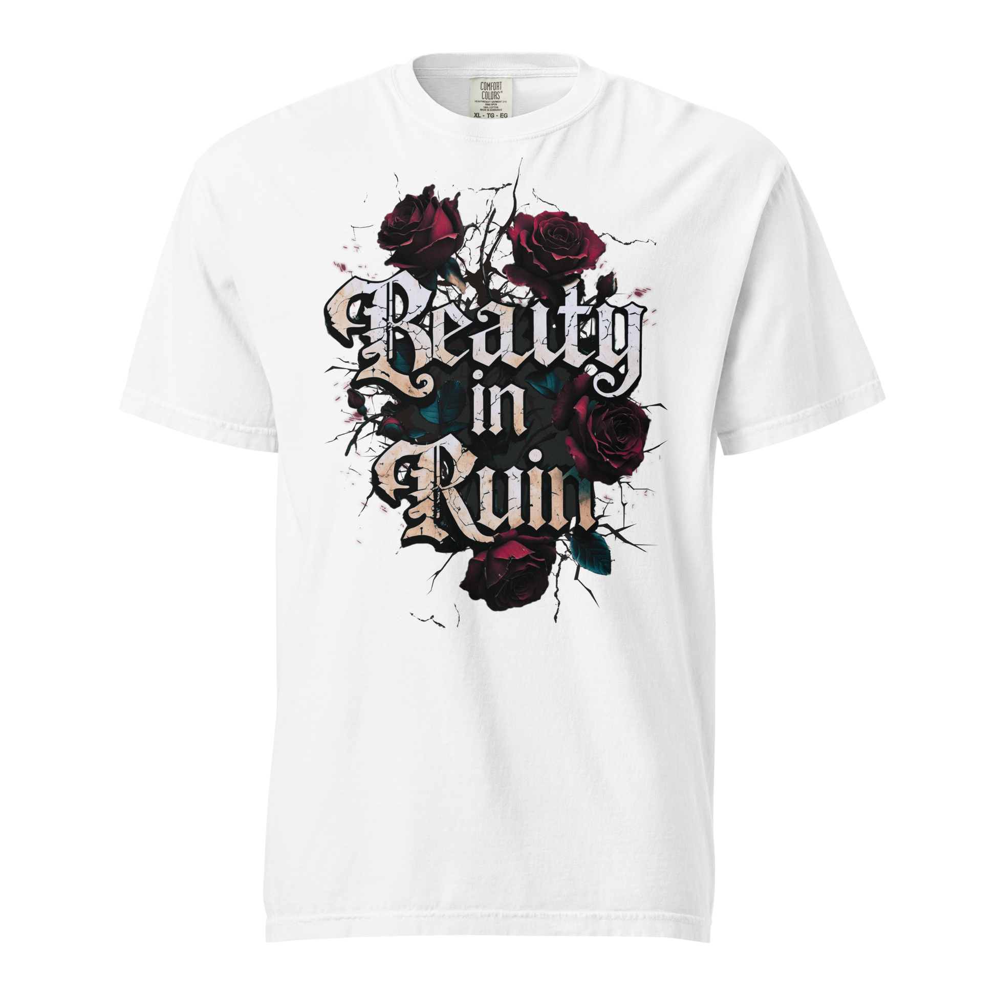 This design takes its cue from vintage tattoo flash and grunge street art: the words “Beauty in Ruin” etched in an edgy cracked font, rough yet delicate, as if chiseled into the side of an abandoned cathedral. Surrounding the phrase: a tangle of thorny roses, petals curling inward, shadows creeping between each bloom.
