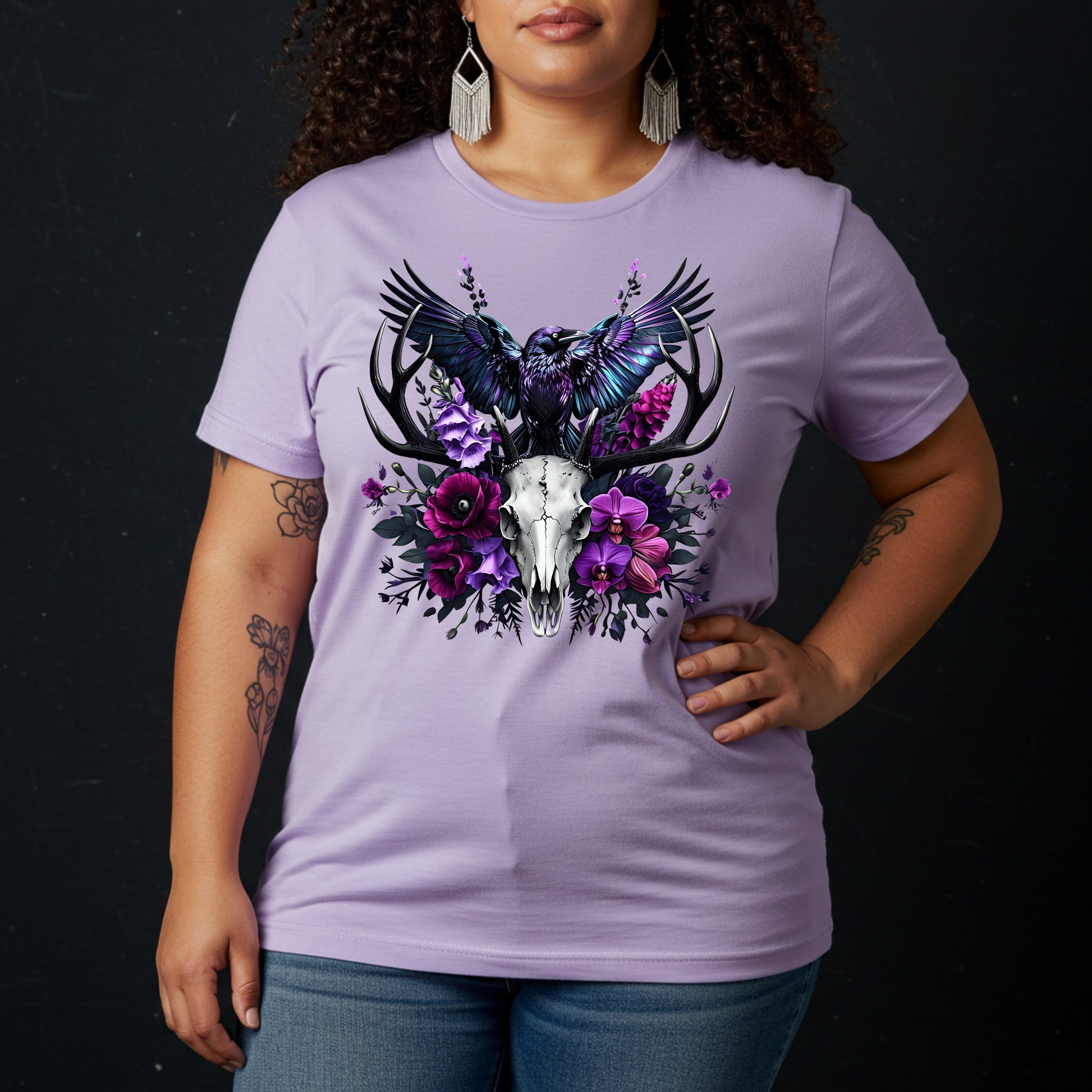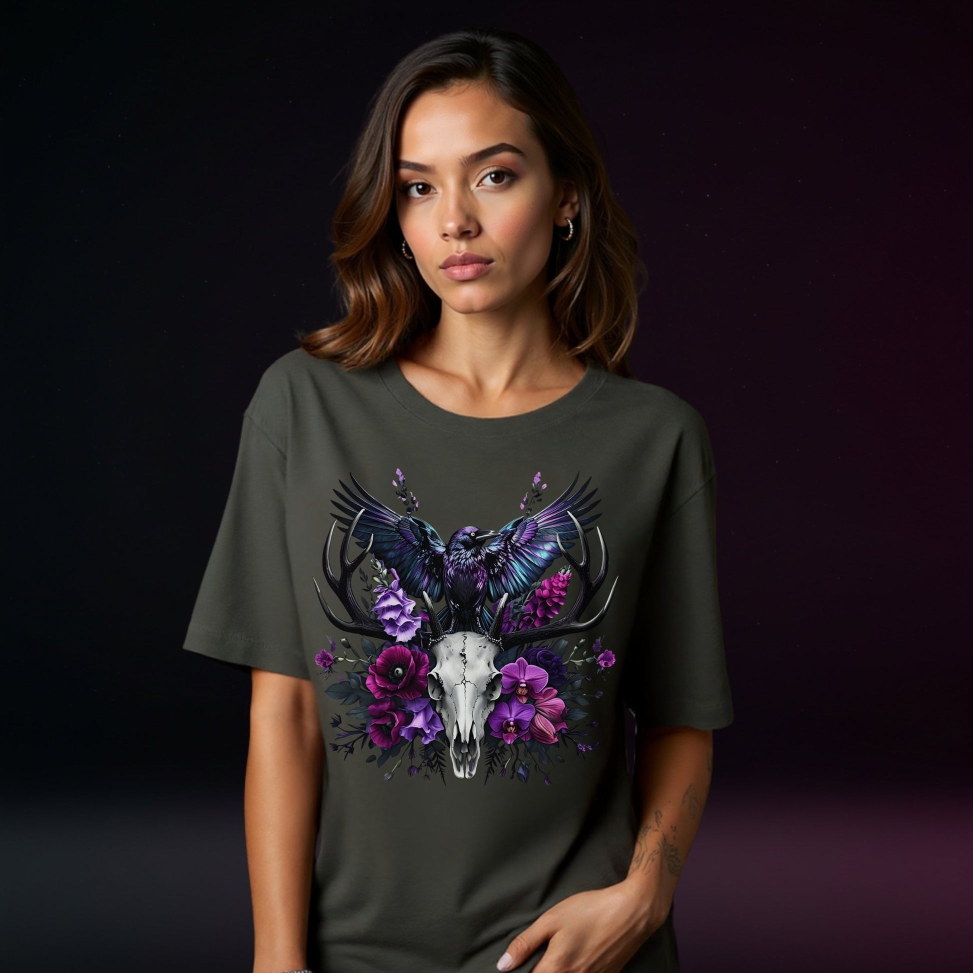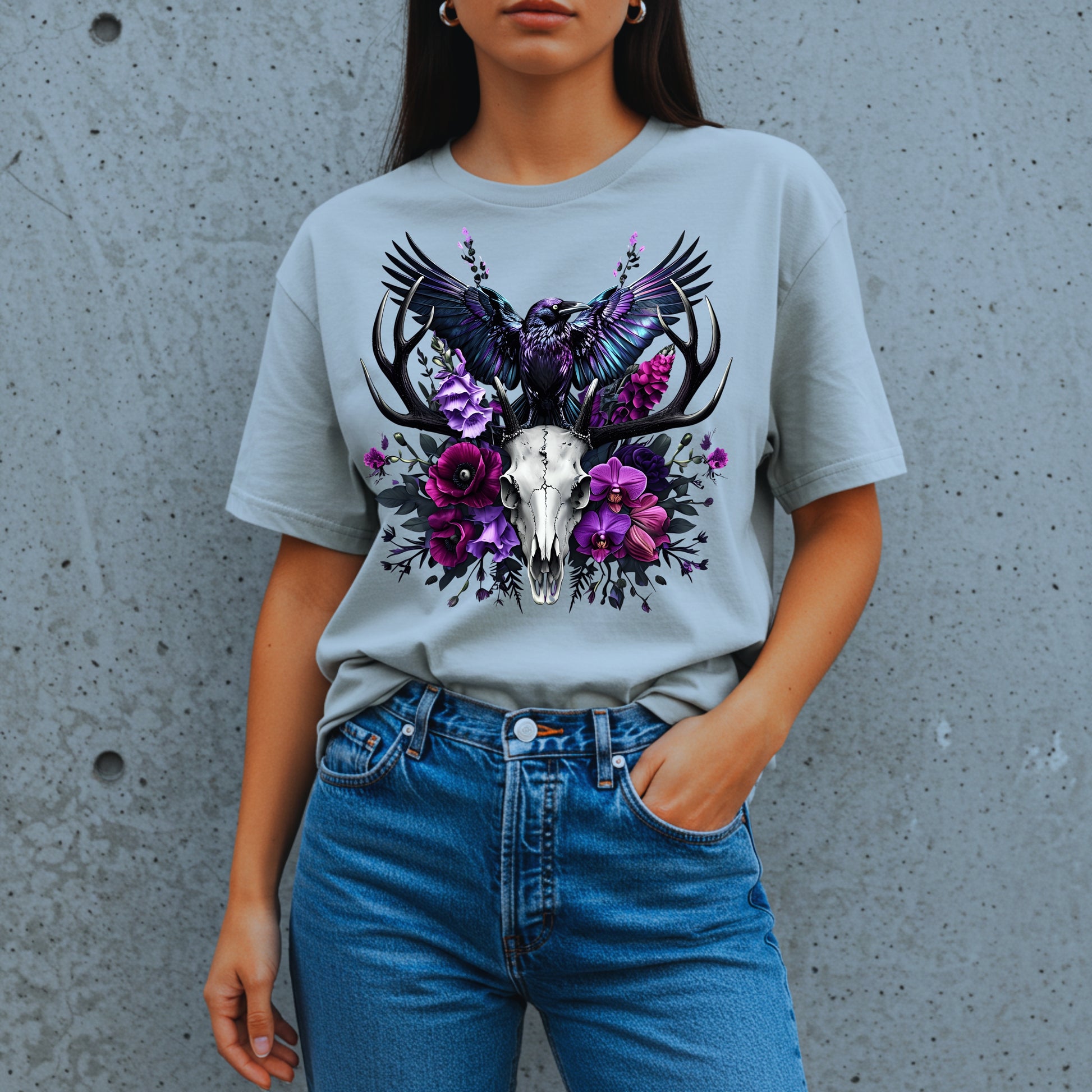 Where shadow meets bloom, a new kind of beauty rises. This powerful design features a majestic raven, wings outstretched, perched upon a weathered deer skull. Iridescent feathers shimmer against the bone, while vivid magenta and deep purple florals burst from below—symbolizing life reborn from decay.