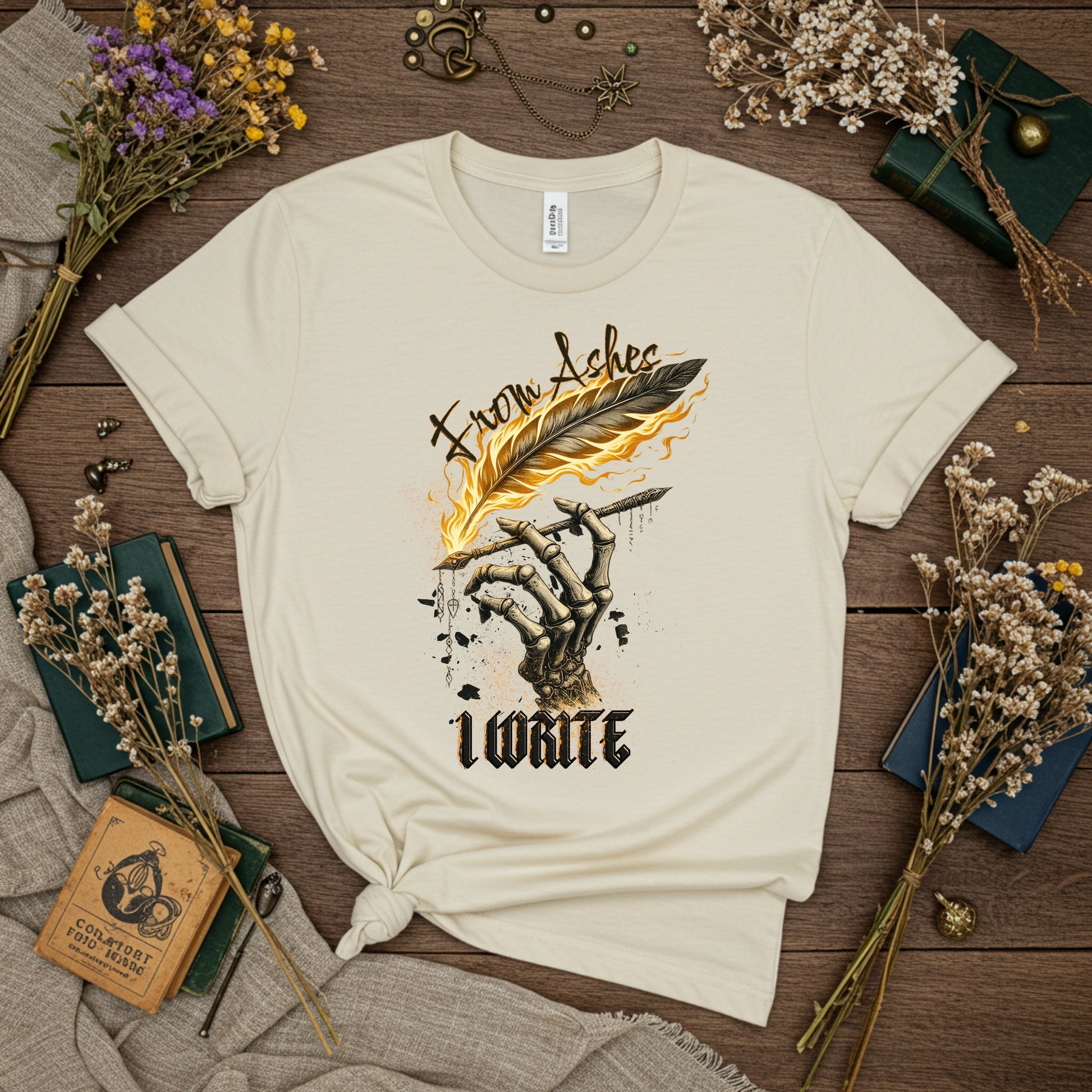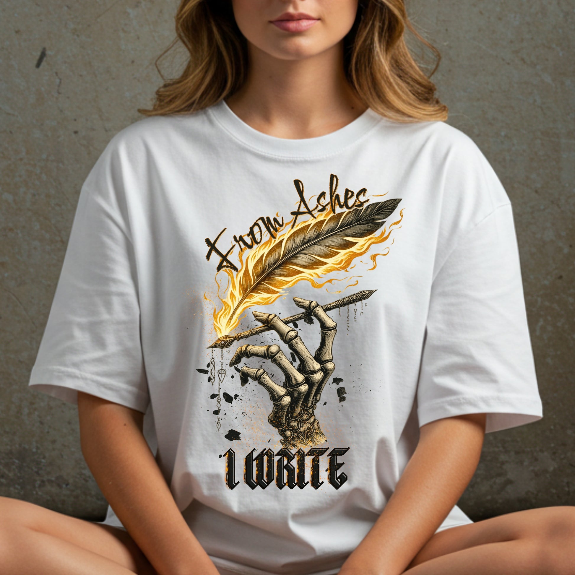 On the front, a skeletal hand grips a flaming feather quill. The words From Ashes blaze within the fiery plume, while I Write smolders along the edges like burning parchment. Crafted in a distressed, high‑detail style, this piece captures the power of rebirth, shadow, and story.