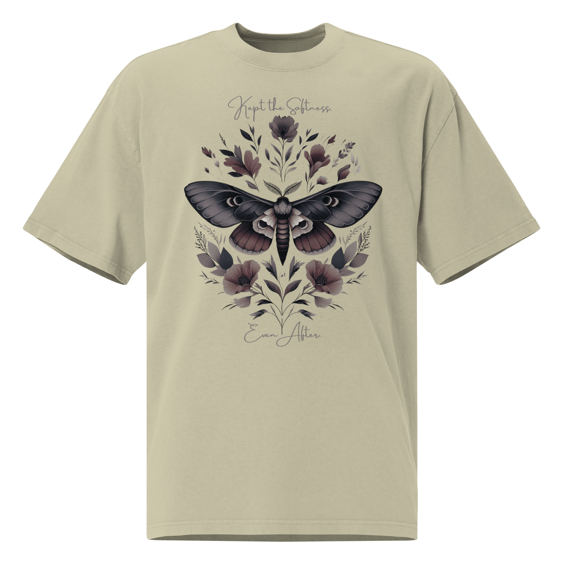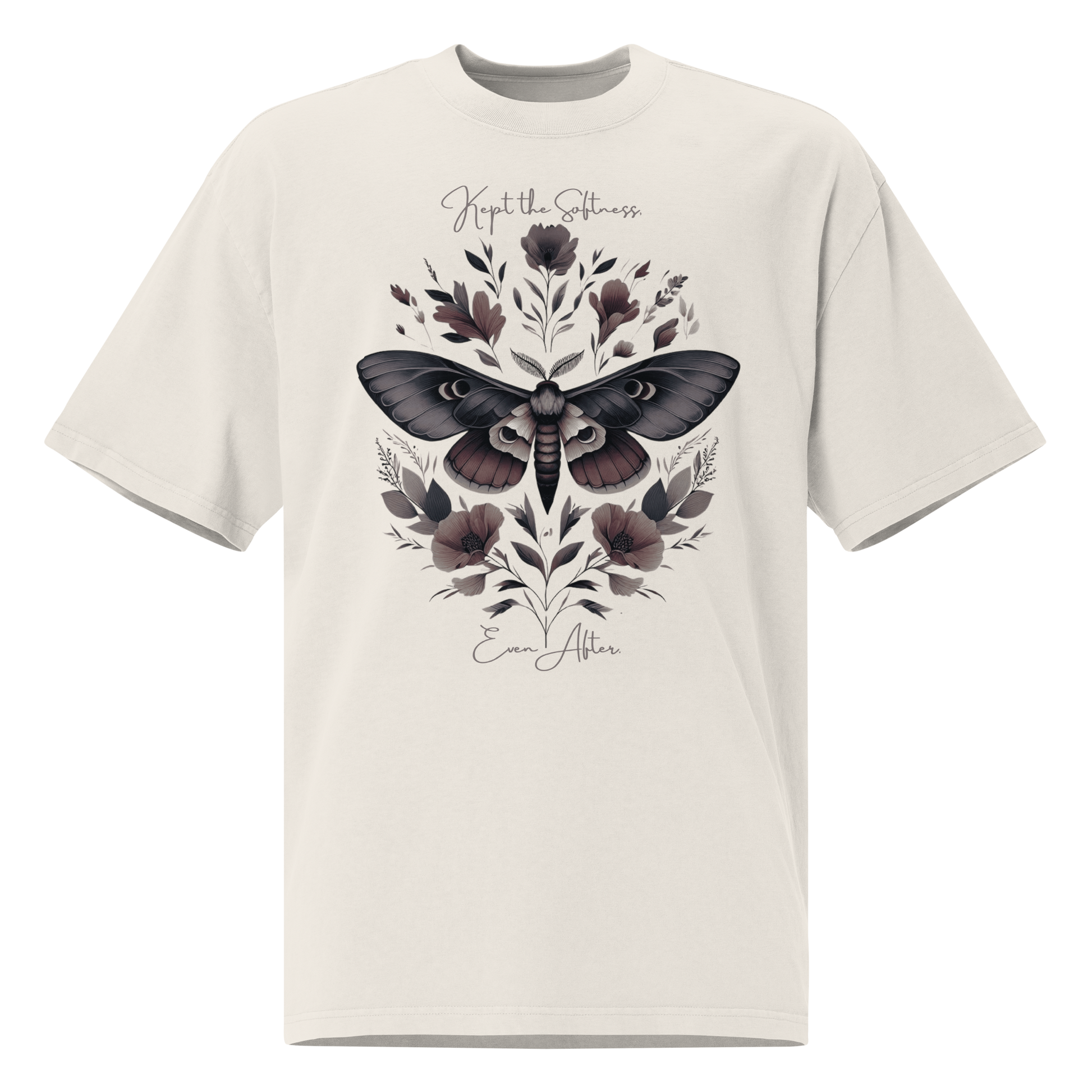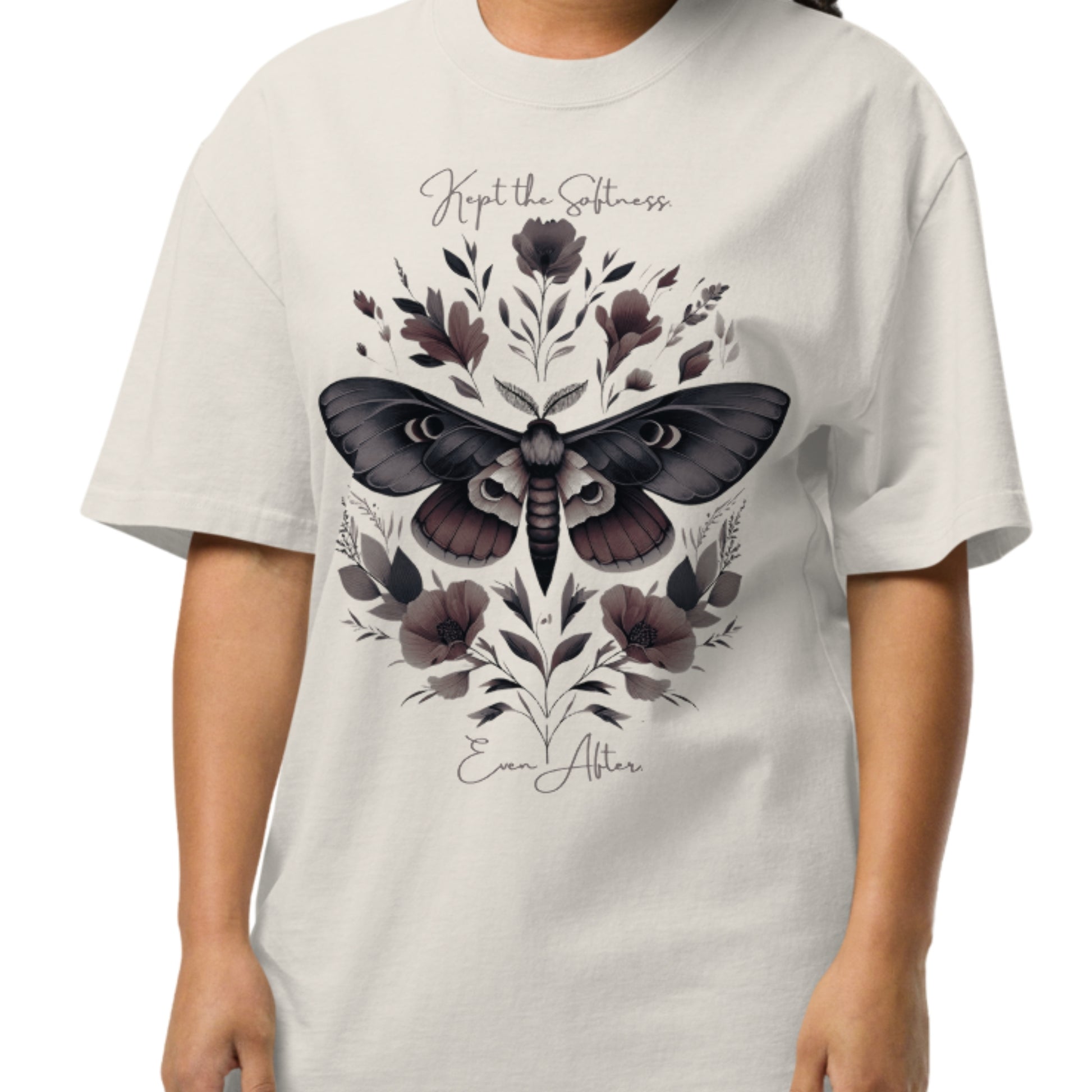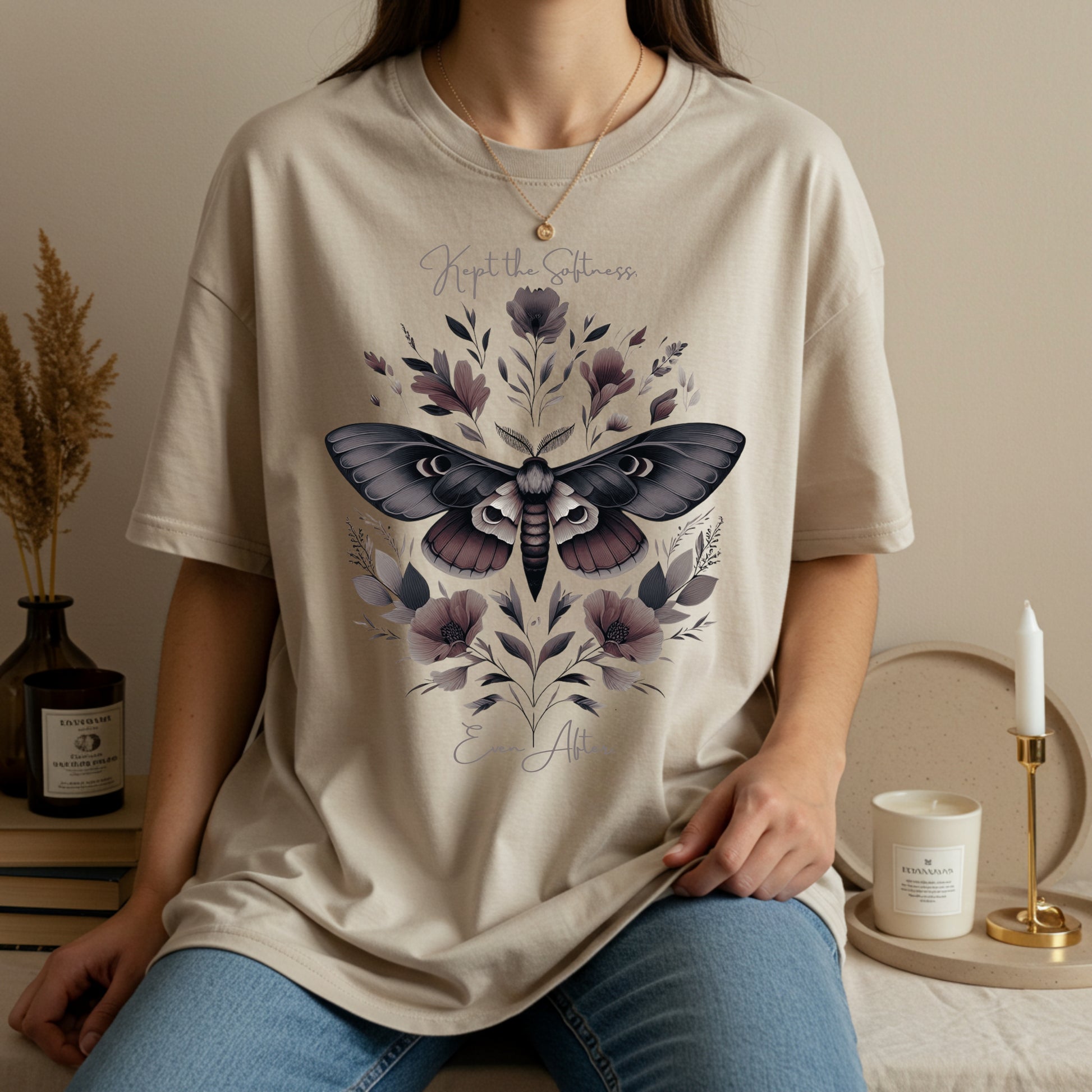 A tribute to the quiet resilience of those who bloom through the storm, this design evokes the beauty of staying soft in a world that asks you to harden. Centered around a delicately detailed luna moth, its wings are surrounded by vintage-inspired flora—faded blooms, curling leaves, and faint wild stems, rendered in timeless neutrals with earthy undertones.