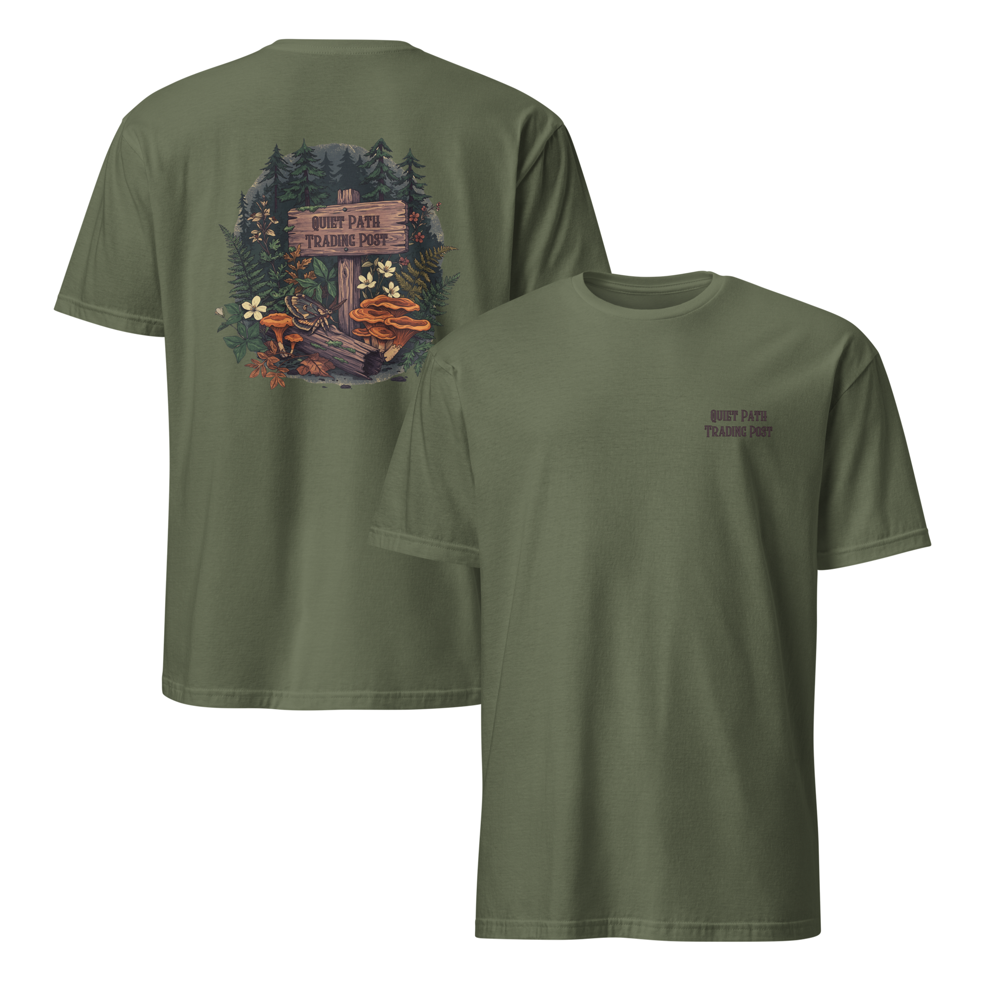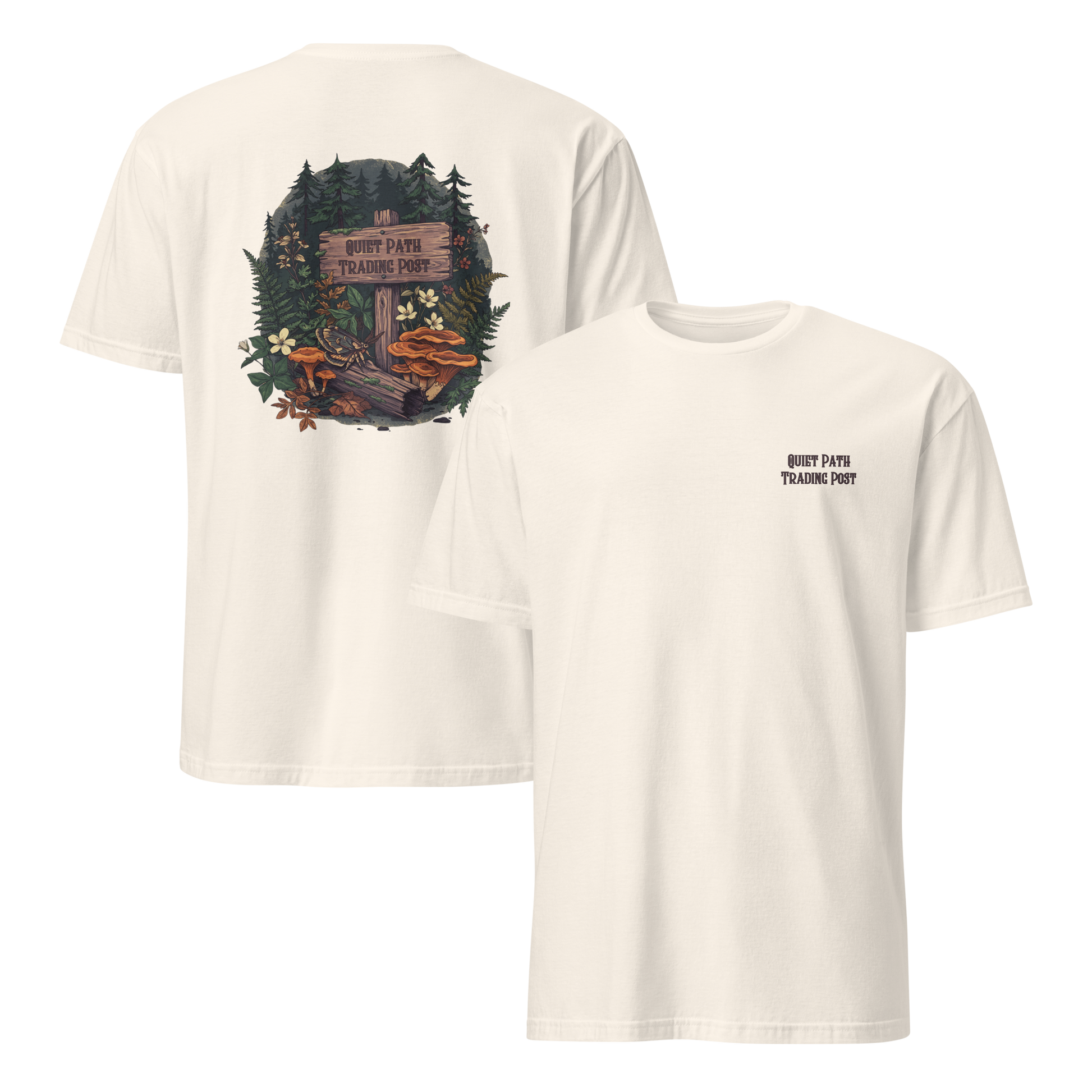 The main illustration appears on the back, while a simple “Quiet Path Trading Post” in vintage trail font is placed over the left chest on the front.