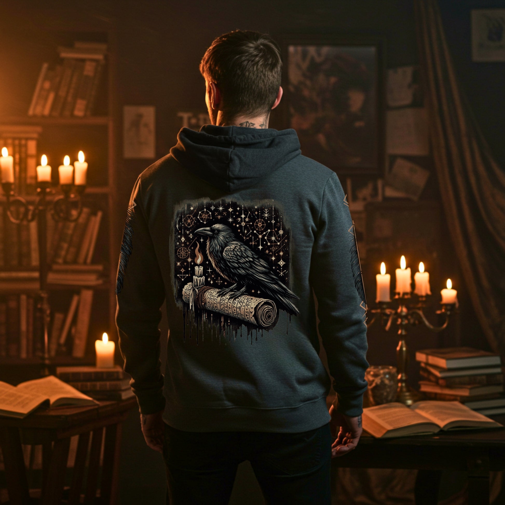 On the back, a striking raven perches on an ancient scroll carved with runes, its ink curling upward into glowing constellations. The long sleeves feature matching vertical raven feathers accented with golden celestial details, while the front left chest displays the crossed feathers crowned by a moonlit rune circle. Every element is crafted in a slightly distressed, earthy palette of black, charcoal, gold, blood red, and bone white for an authentic Nordic feel.