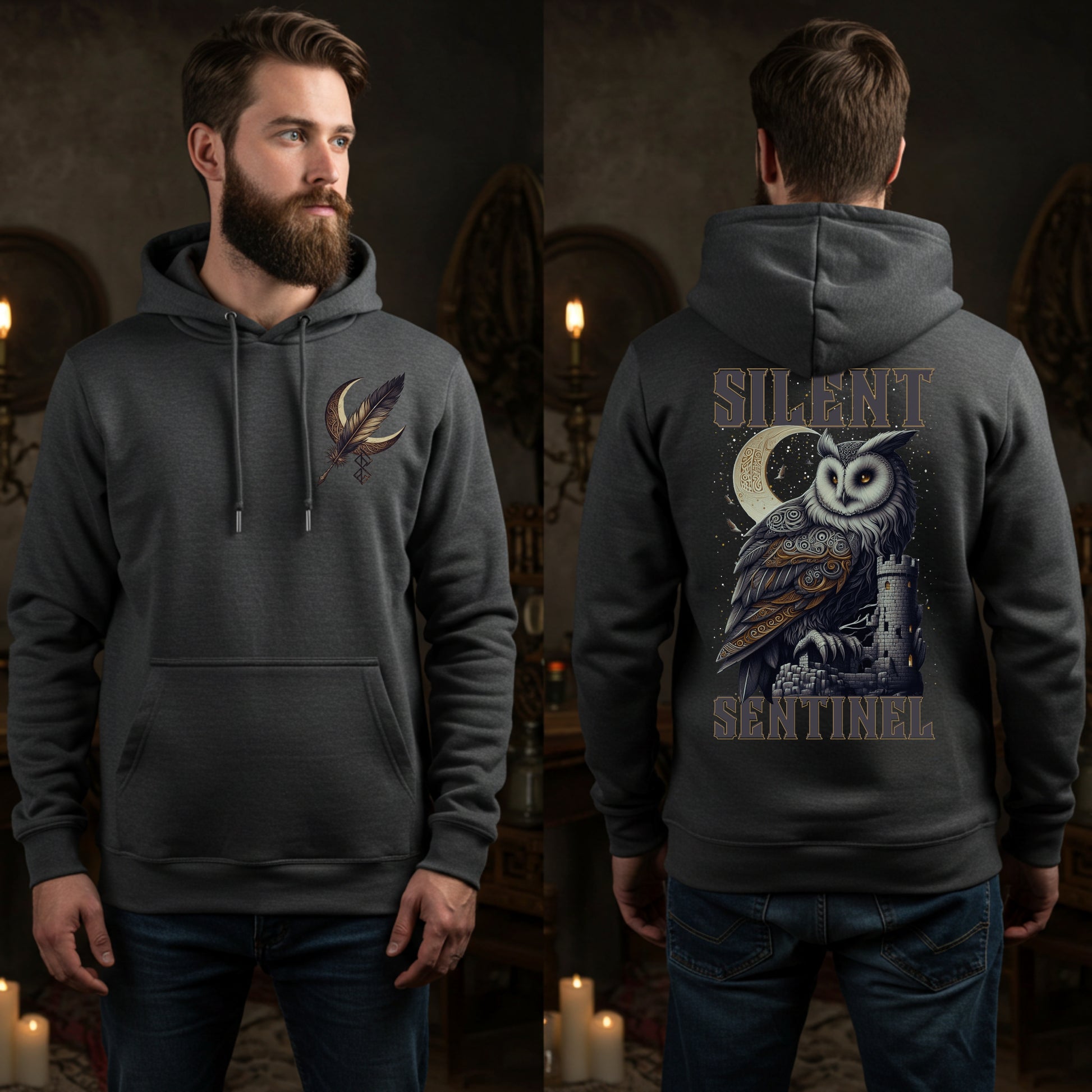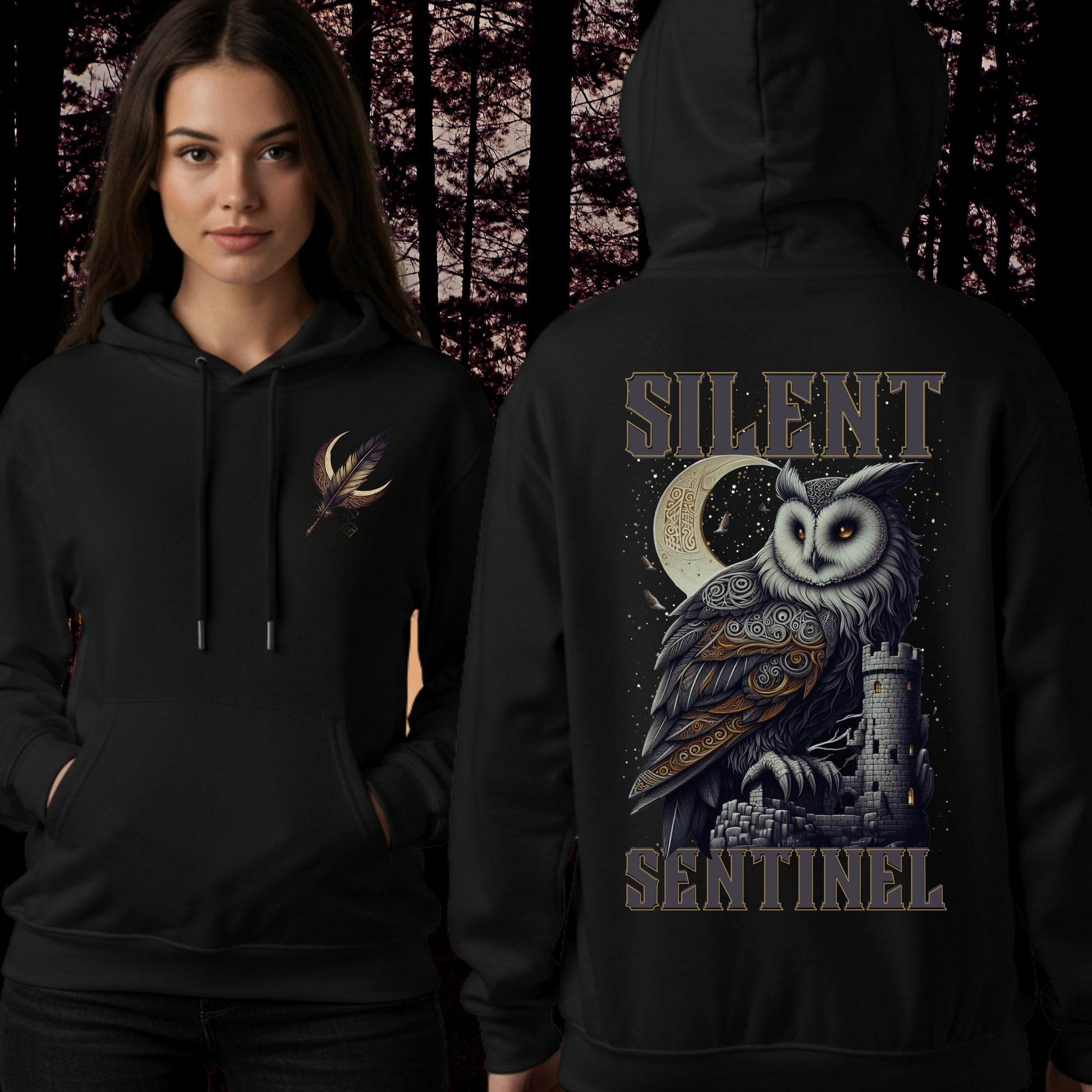 Step into the shadows with the Silent Sentinel Hoodie, a tribute to the wisdom and watchfulness of the night.