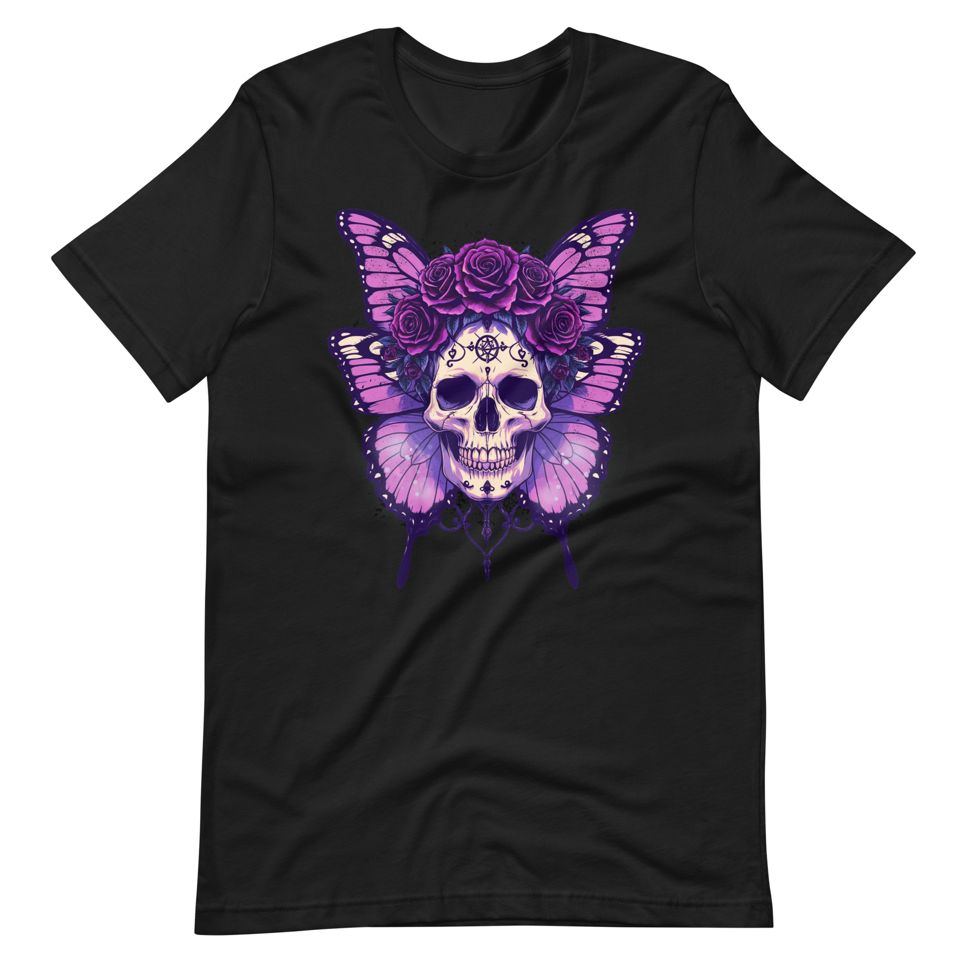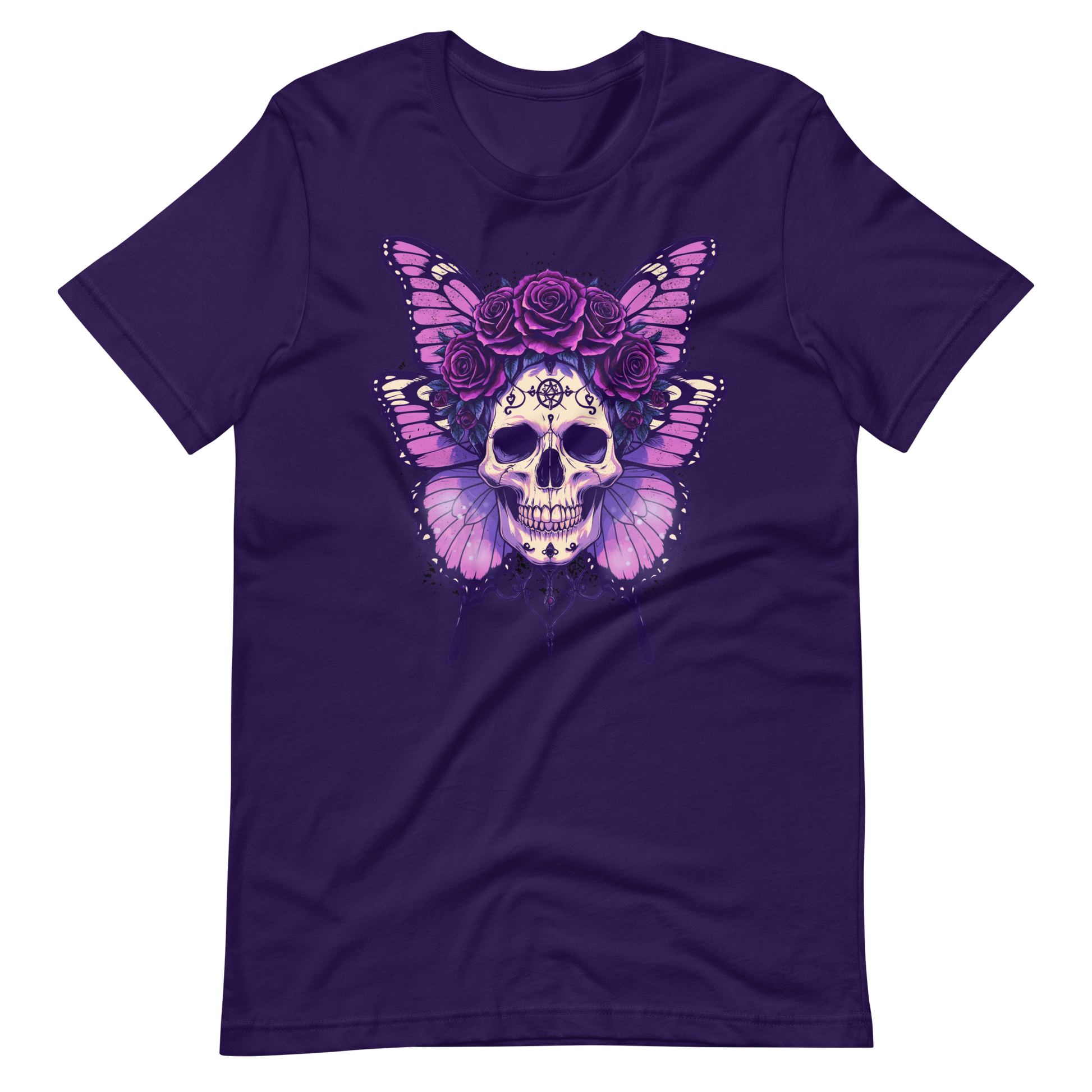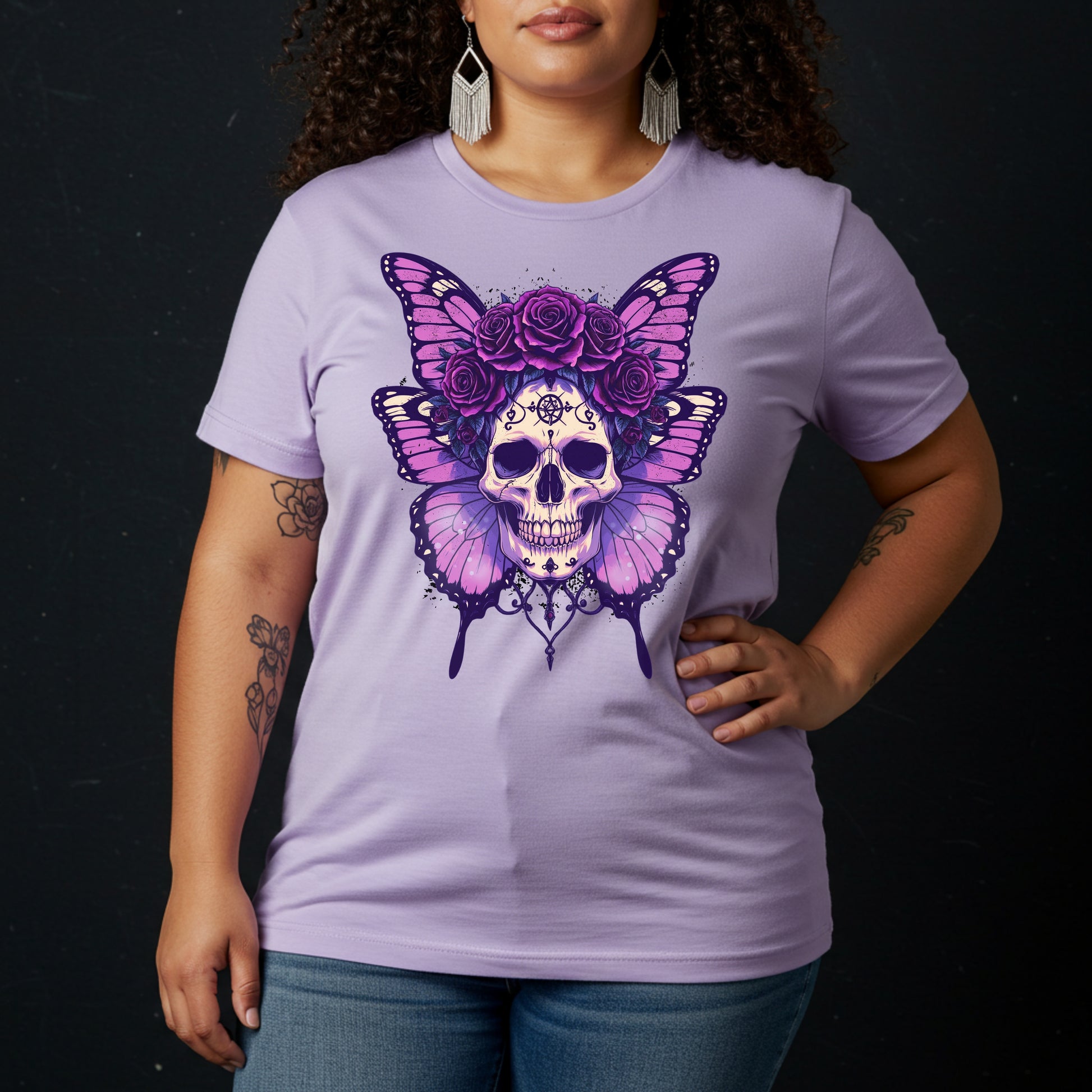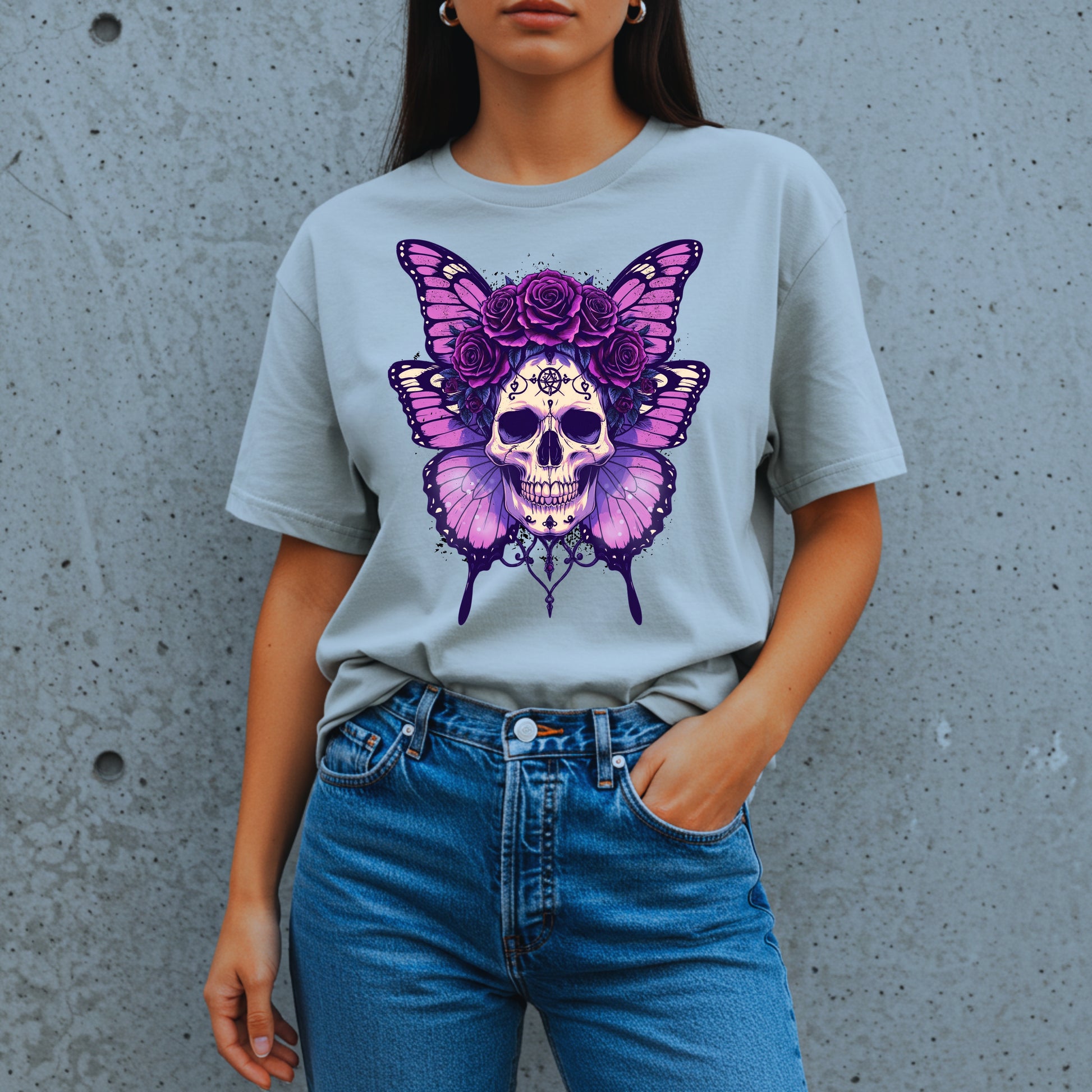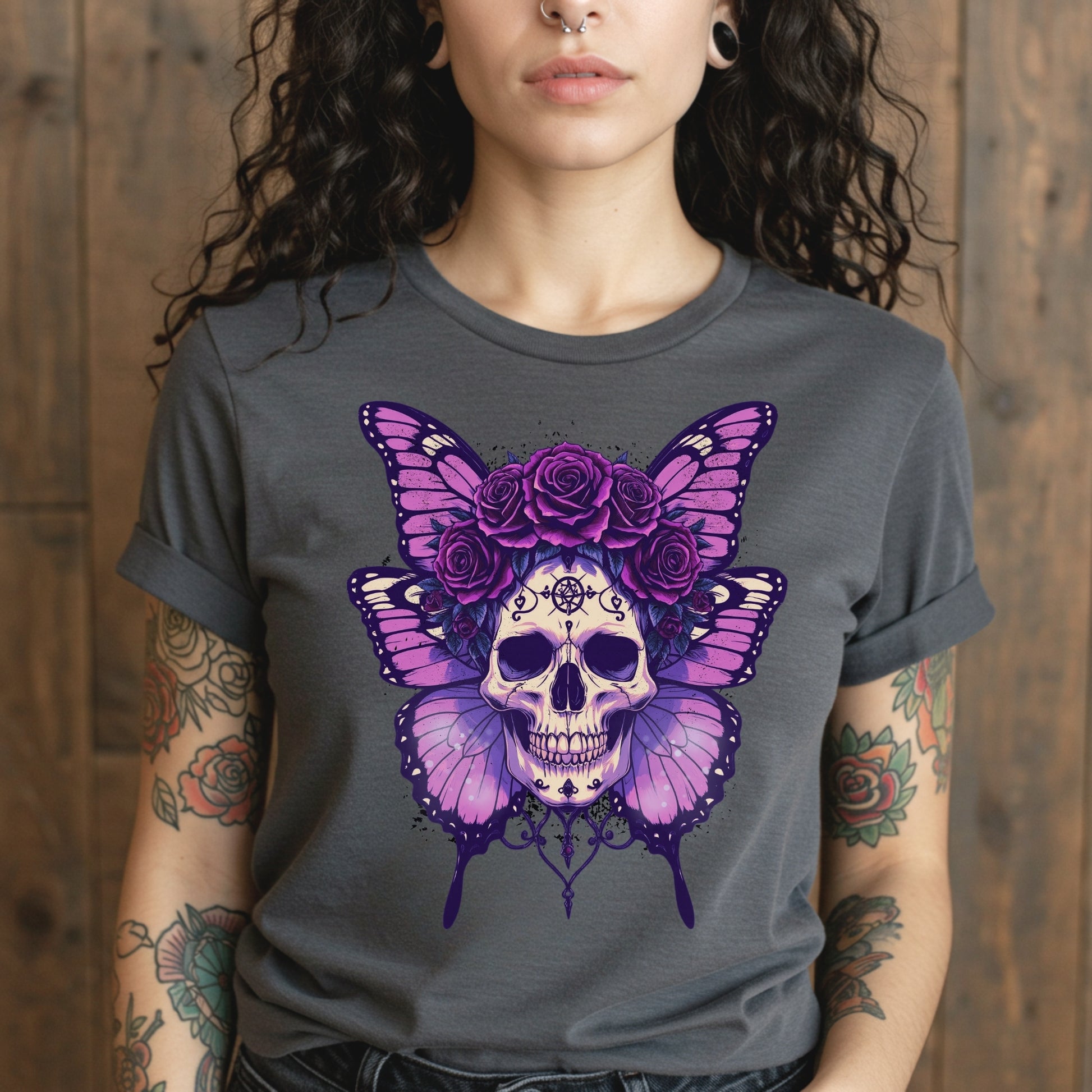 Darkly delicate yet fiercely defiant, this design pairs the mystique of the skull with the fragile freedom of butterfly wings. A single purple rose crown rests atop the skull, its petals deep and rich like bruised velvet — a symbol of transformation, mortality, and gothic romance.