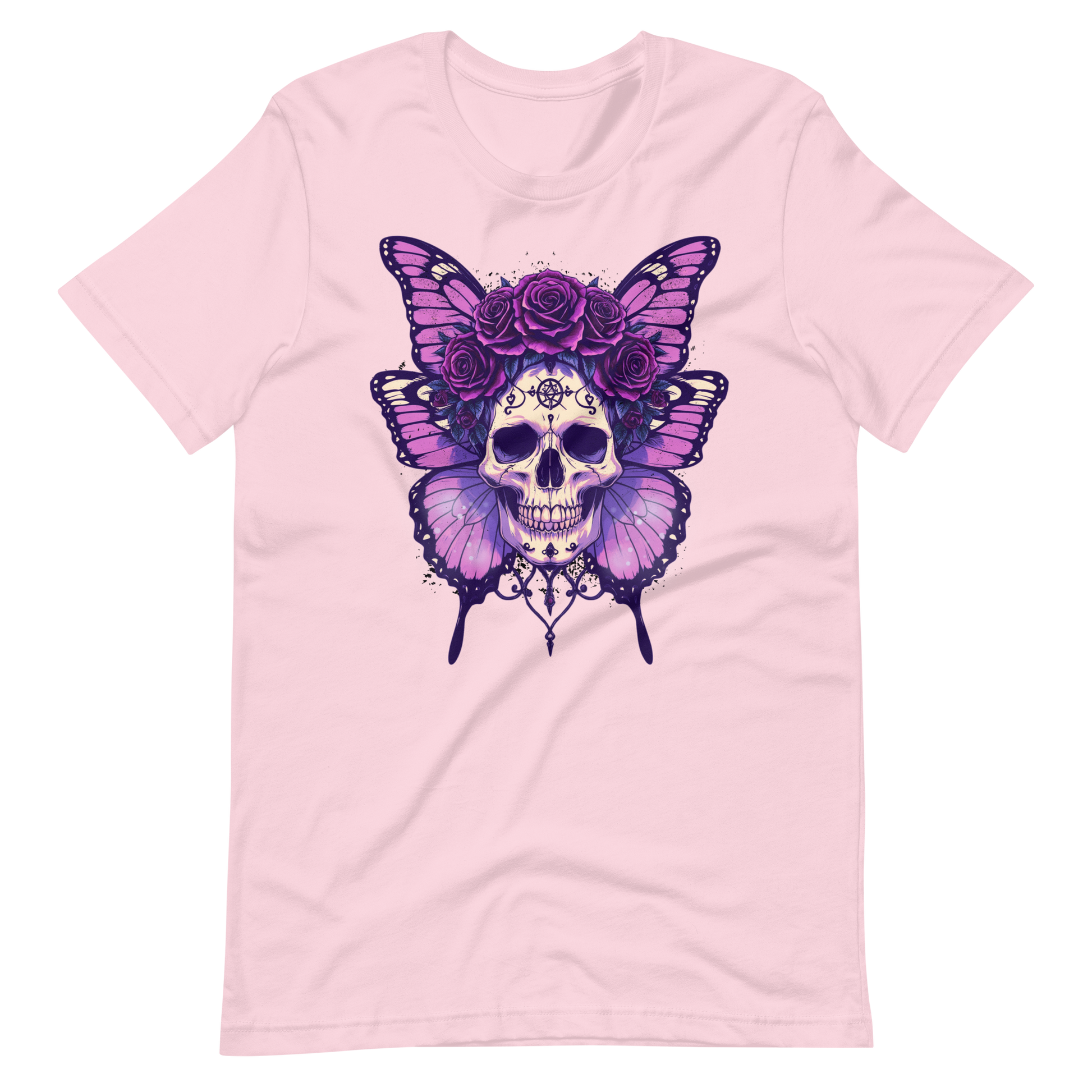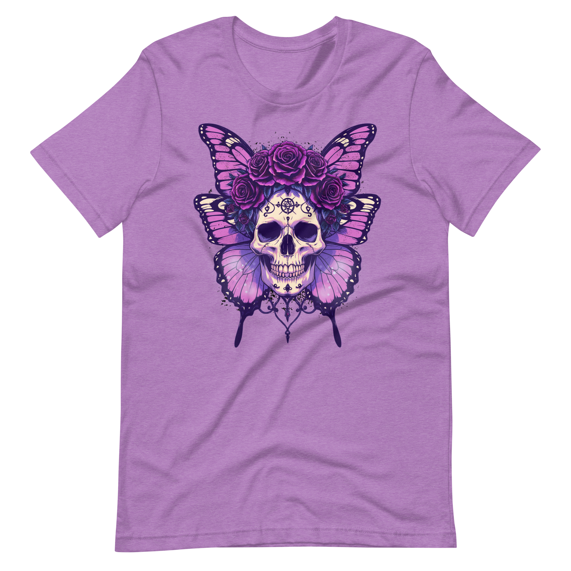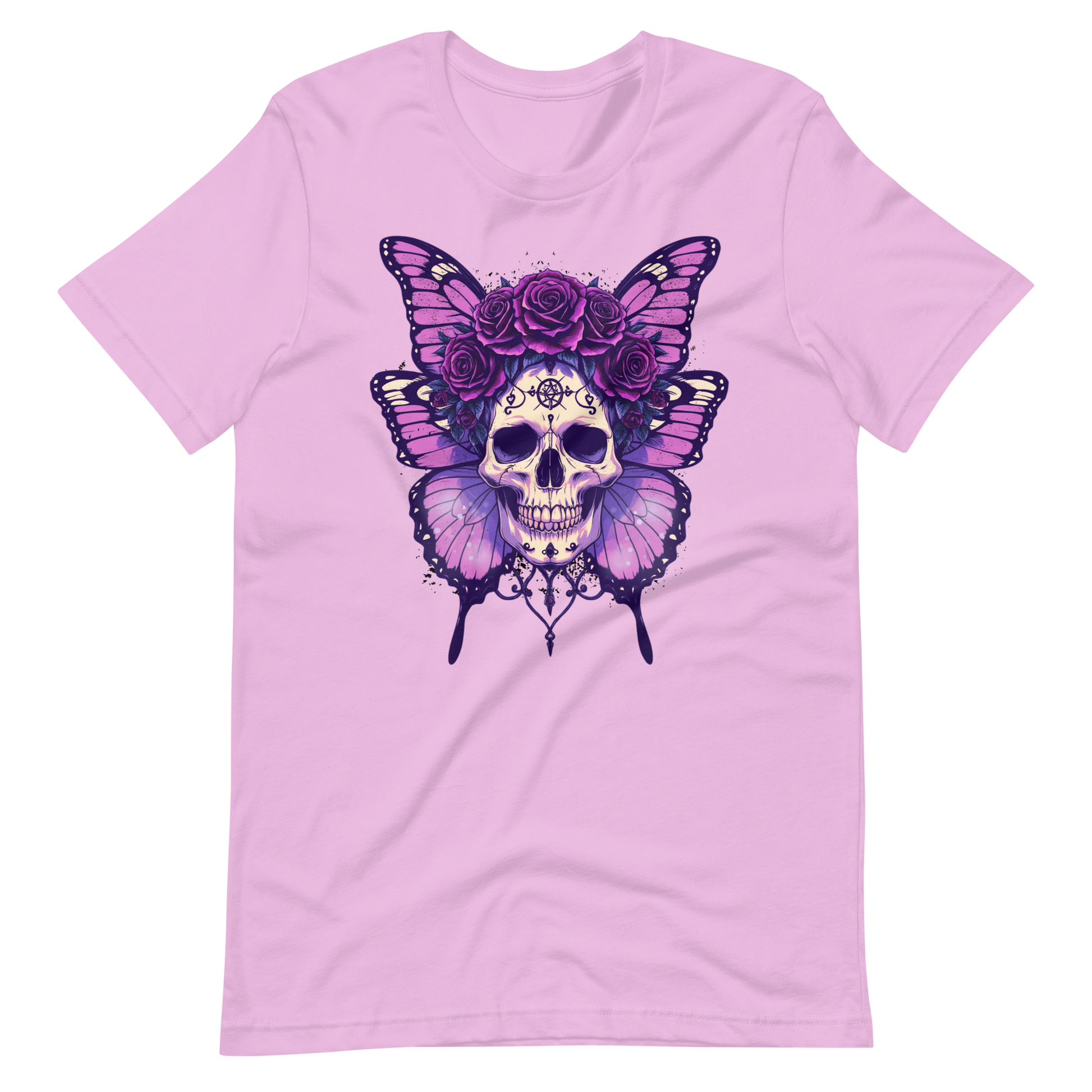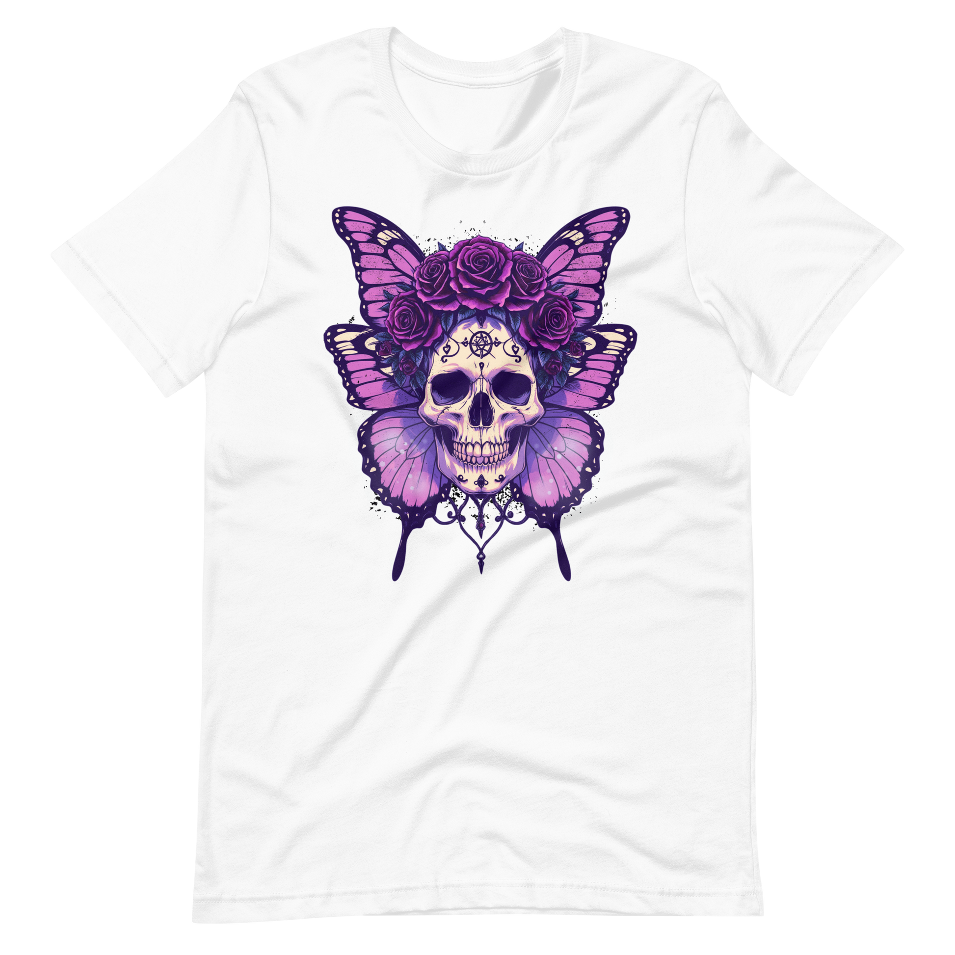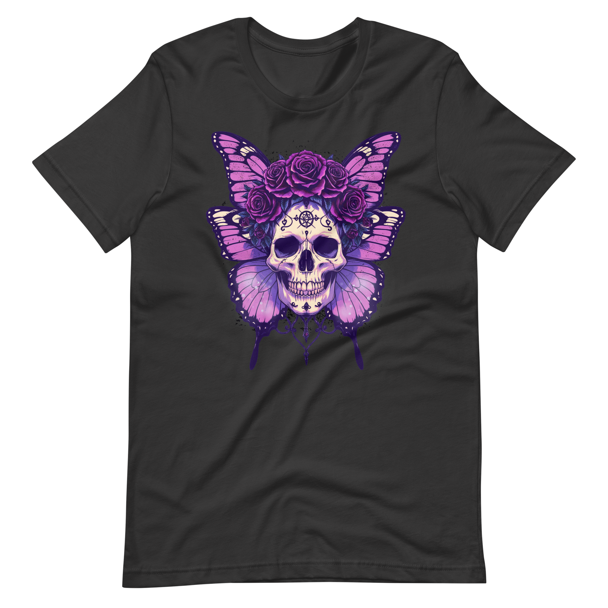 Darkly delicate yet fiercely defiant, this design pairs the mystique of the skull with the fragile freedom of butterfly wings. A single purple rose crown rests atop the skull, its petals deep and rich like bruised velvet — a symbol of transformation, mortality, and gothic romance.