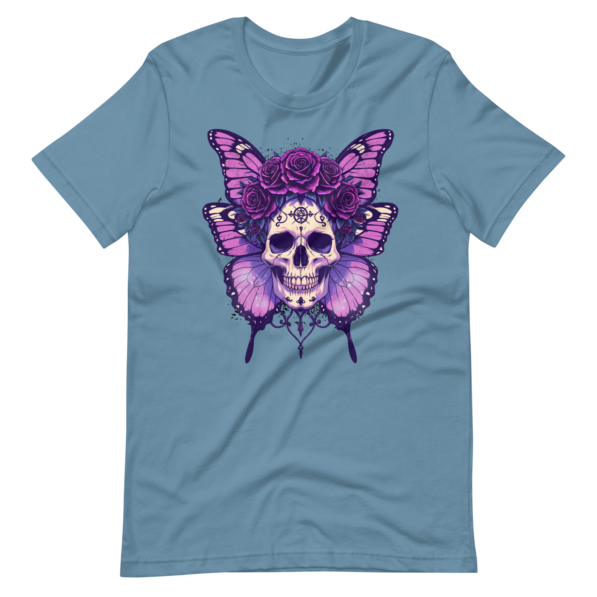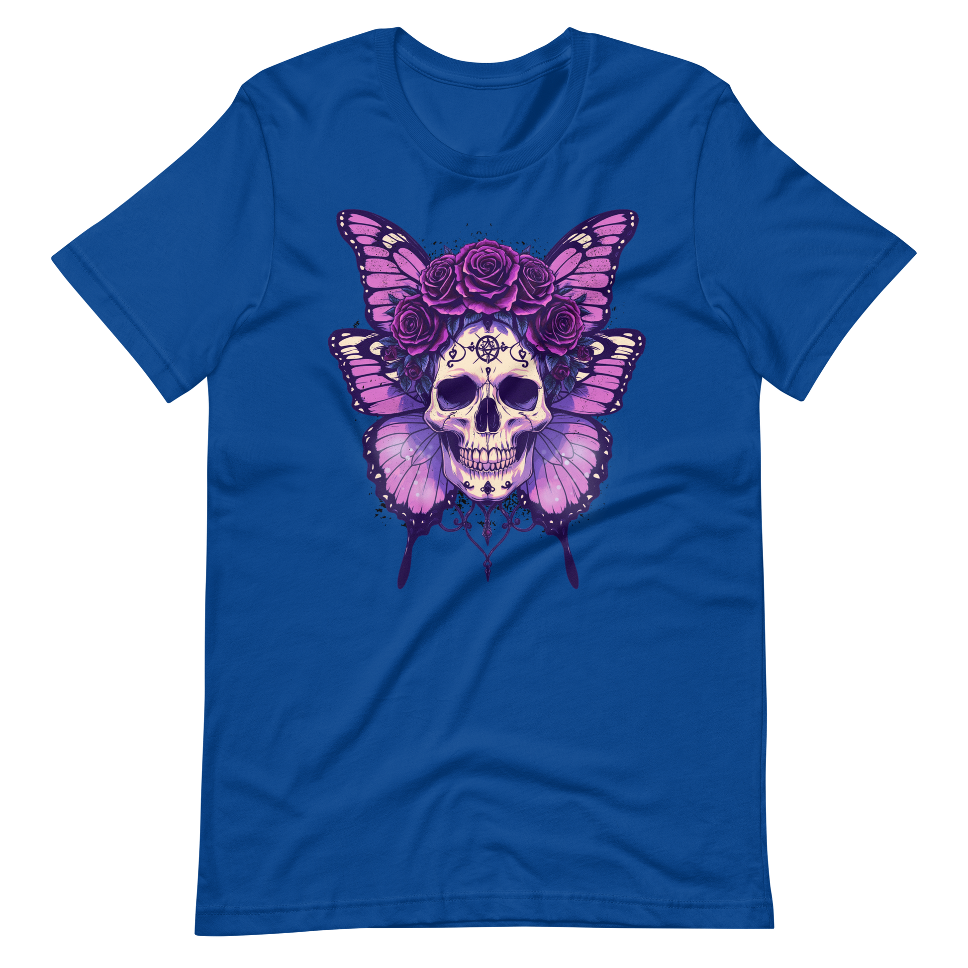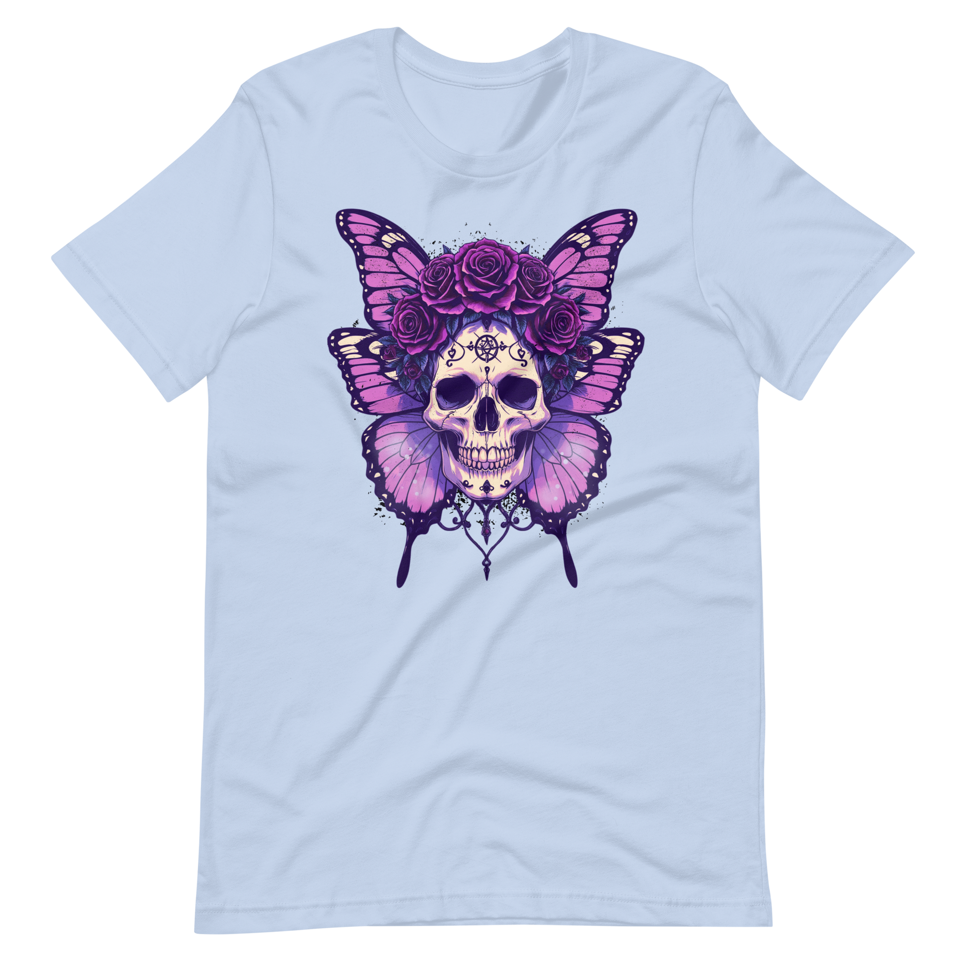 Set in a palette of moody purples, electric blues, soft ivory, and shadowy blacks, every detail feels both punk and poetic. The butterfly wings stretch wide behind the skull, a nod to metamorphosis and the power that lives in embracing the dark and beautiful unknown.